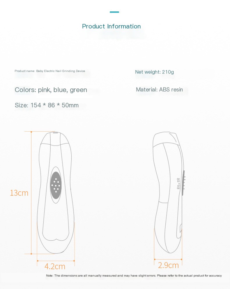 Say goodbye to traditional nail clippers that can be intimidating and risky for little fingers. With our electric nail grinder, you can effortlessly and painlessly shape and polish your child's nails. The whisper-quiet operation means your baby won't be disturbed, making nail care a breeze for both of you.